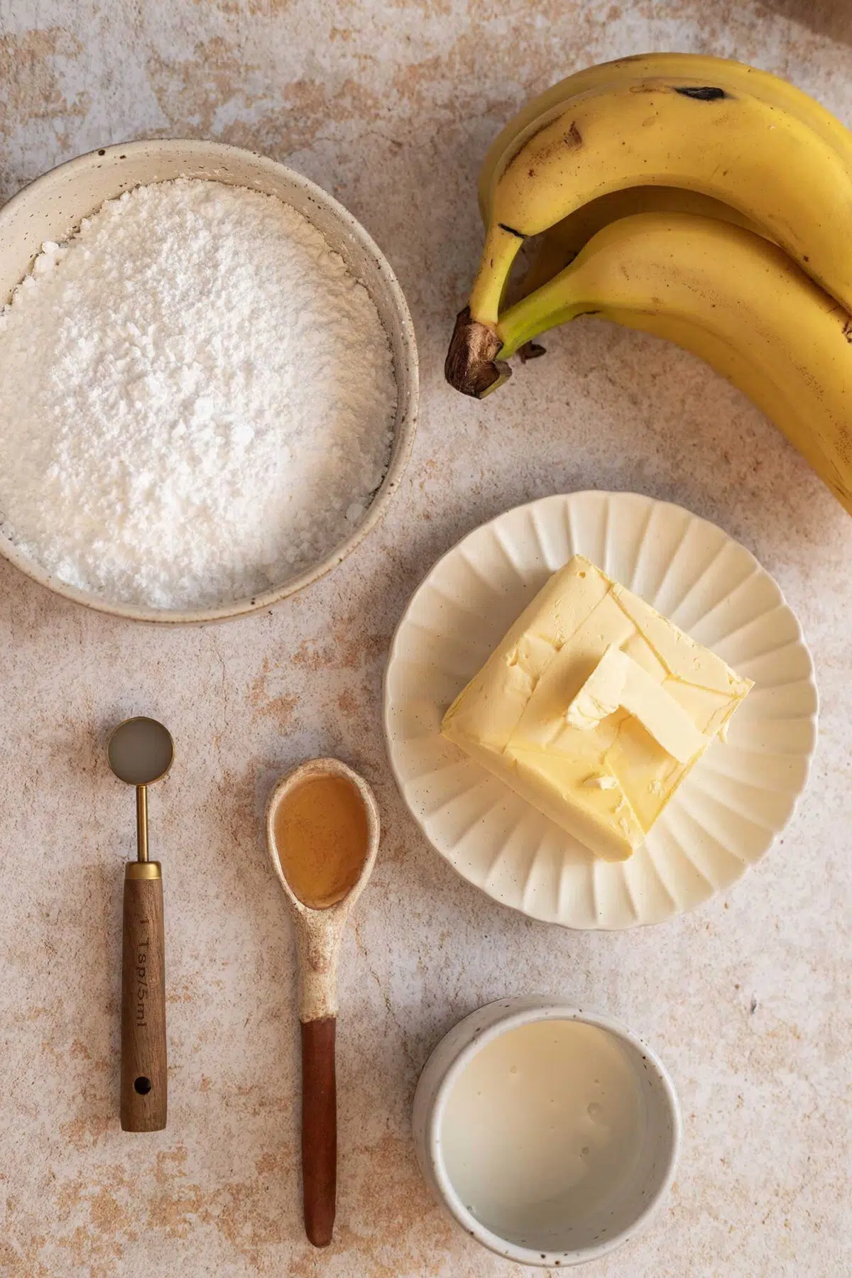 Icing sugar: Icing sugar is used to sweeten and thicken the banana frosting. Powdered erythritol may work as a sugar-free option if you want to make this recipe low-sugar.