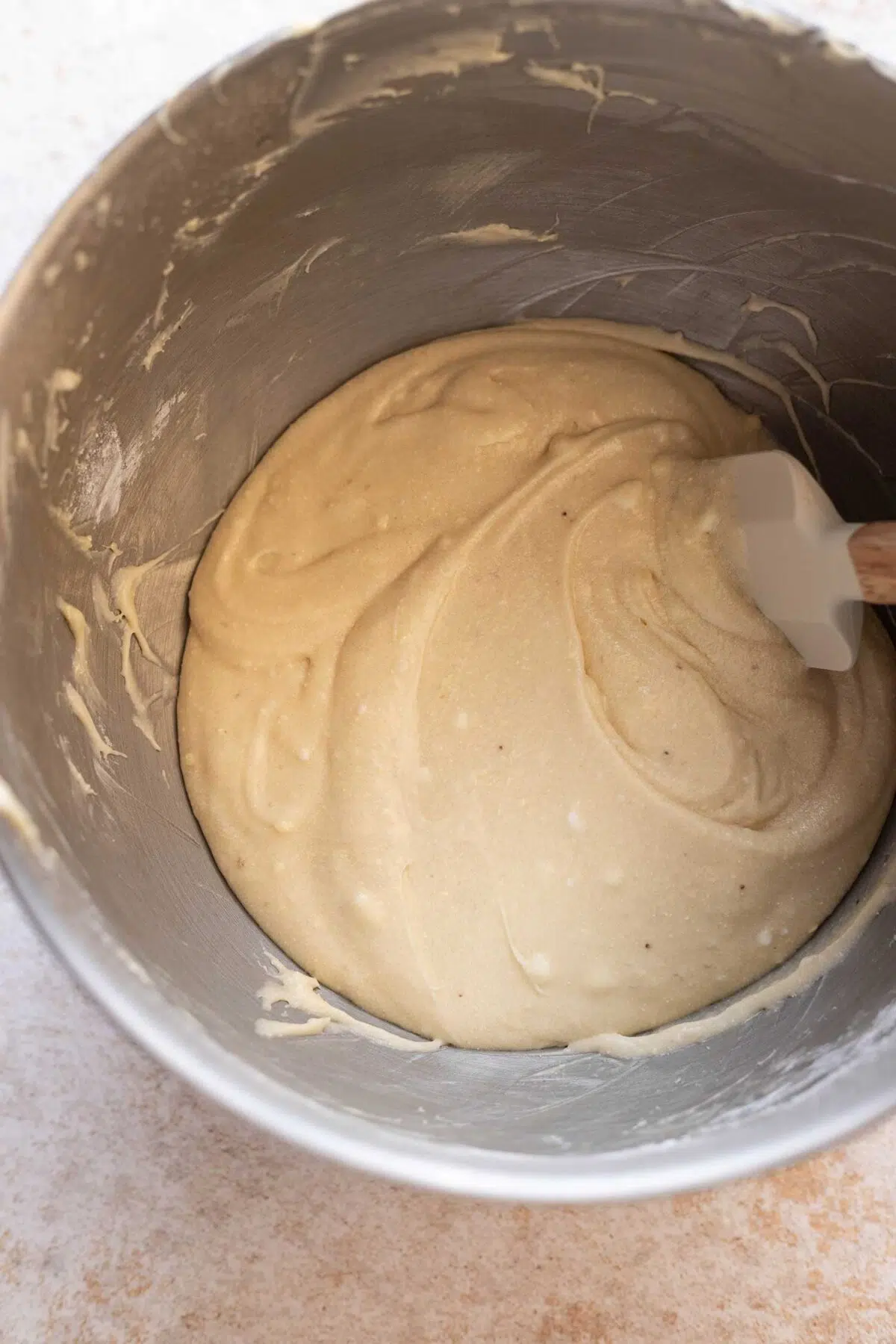 Next, add the banana paste, vanilla extract, and soy whipping cream to the whipped butter. Beat further until they are all well combined, about 1-2 mins.