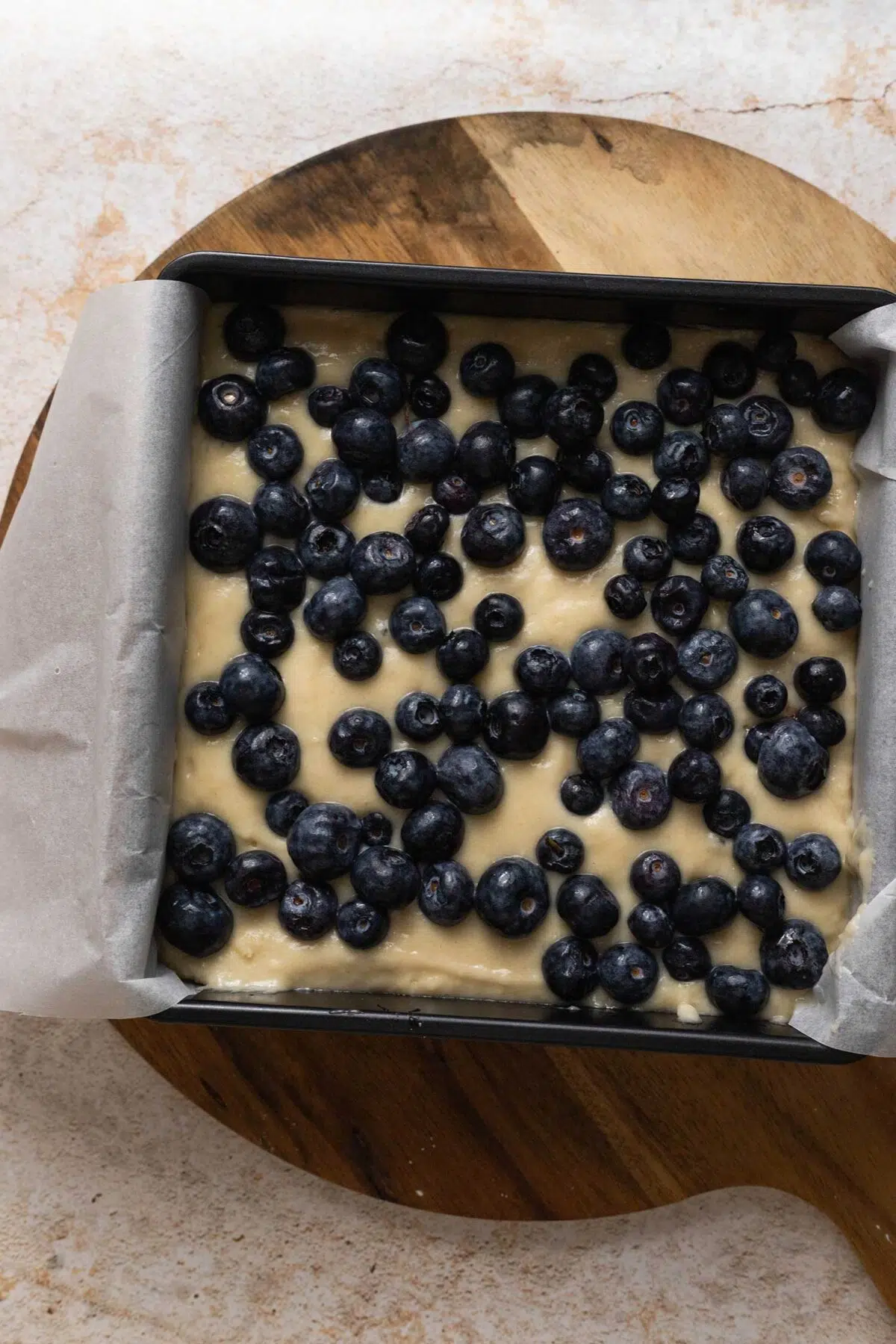 - Pour the batter into your lined square tin and use the spatula to spread it evenly into the corners. Scatter the fresh blueberries evenly over the batter.
