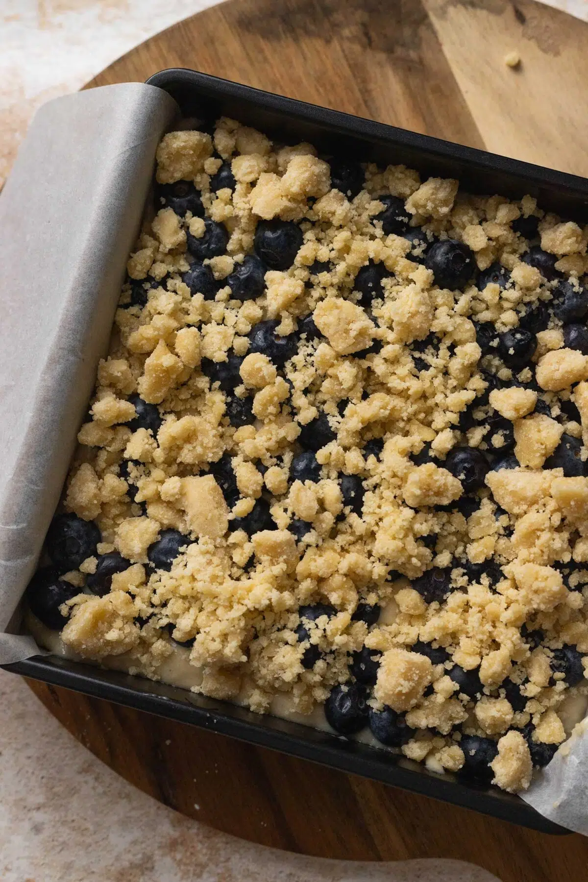Pour the batter into your lined square tin and use the spatula to spread it evenly into the corners. Scatter the fresh blueberries evenly over the batter. Finally, remove the crumble from the fridge and use your fingers to break it into lovely, chunky pieces before sprinkling it generously over the blueberries. There you have your cake ready to go into the oven!