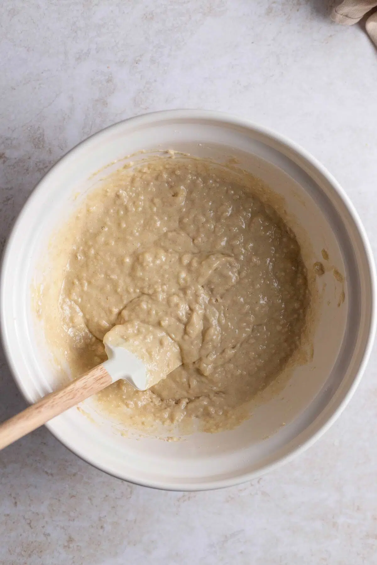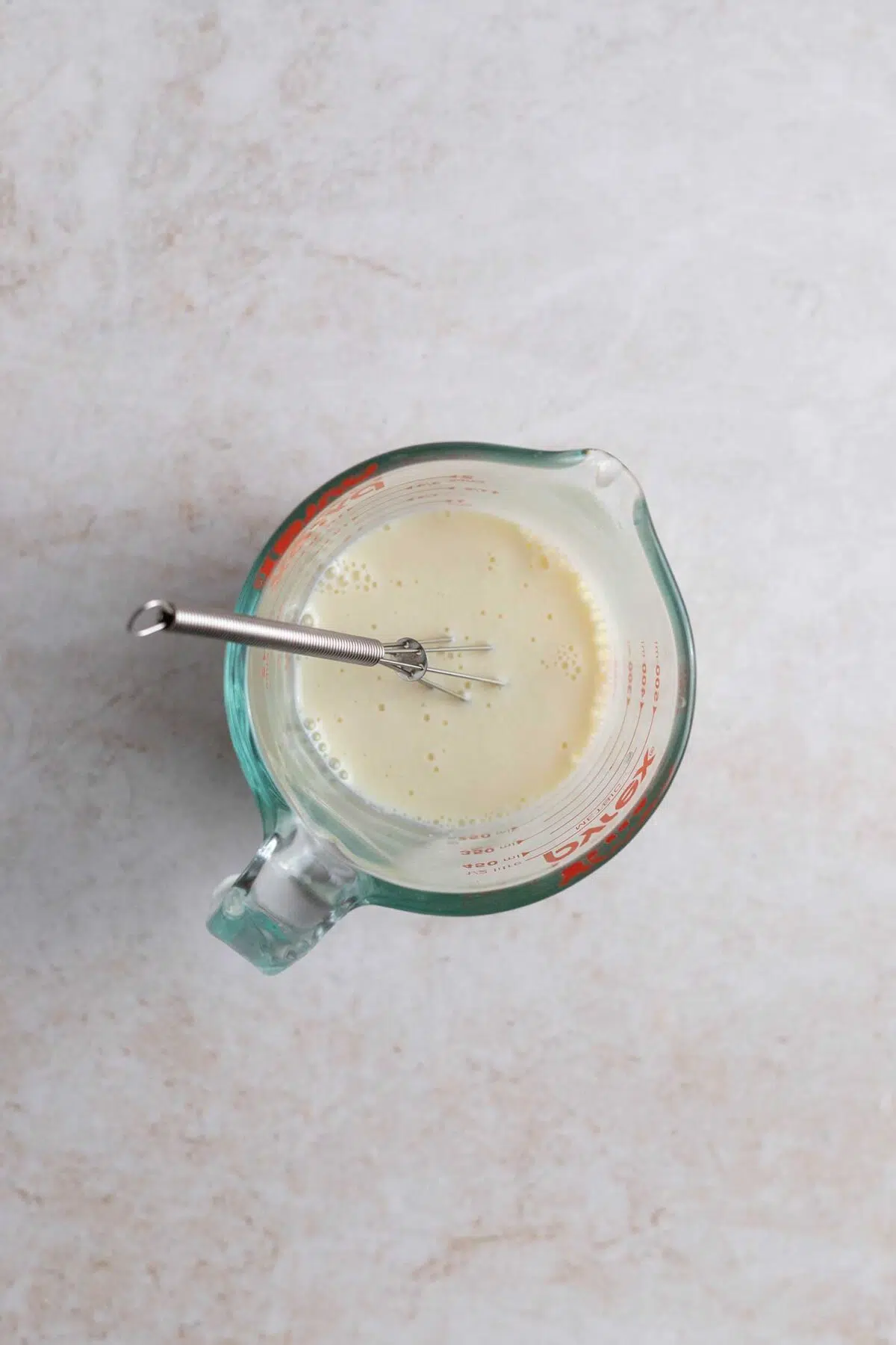 - Mix the melted vegan butter, soy milk, applesauce, and vanilla extract very well in a large bowl with a whisk until smooth.