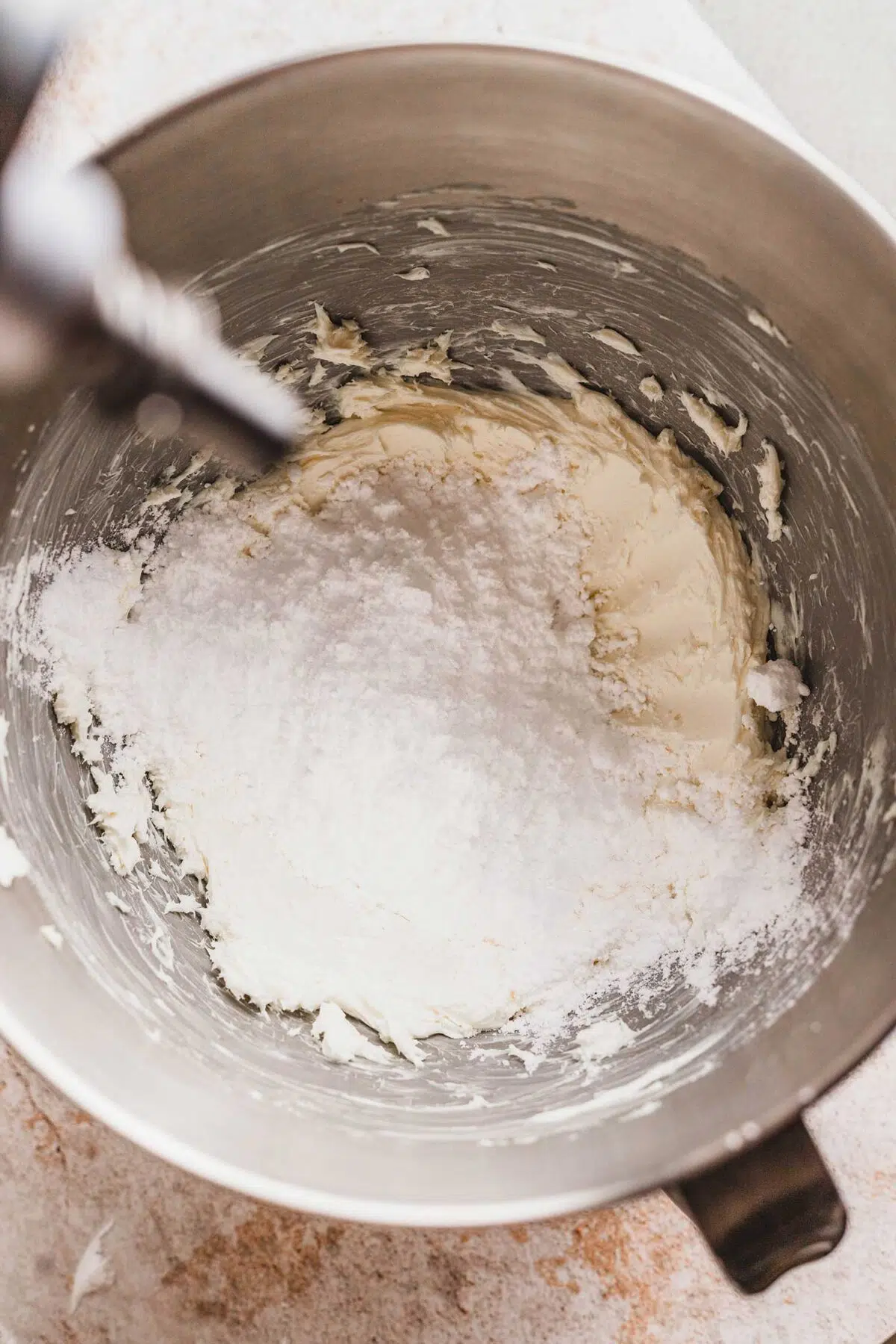 - Gradually add in the icing sugar, one cup at a time, until the frosting is thick and creamy. Add the vanilla extract and mix until well incorporated.